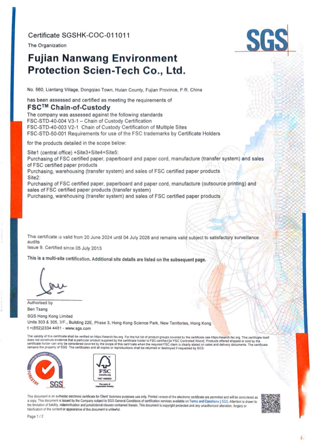 Nanwang has set up subsidiaries in Fujian, Shanghai, Guangdong, Anhui, Hebei, Hubei, Canada, and Indonesia, with its business spanning over 200 countries and regions worldwide. It has established cooperative relationships with numerous renowned brands, including Muji, UNIQLO, KFC, McDonald's, etc. Awarded as a National Service-Oriented Manufacturing Enterprise, a National High-Tech Enterprise, one of the Top 100 Printing Enterprises, and a Fujian Specialized, Special and New Small and Medium-sized Enterprise, among other honors, the company serves as a leader in China's environmental-friendly paper bag sector and ranks among the top in the industry's market segment.